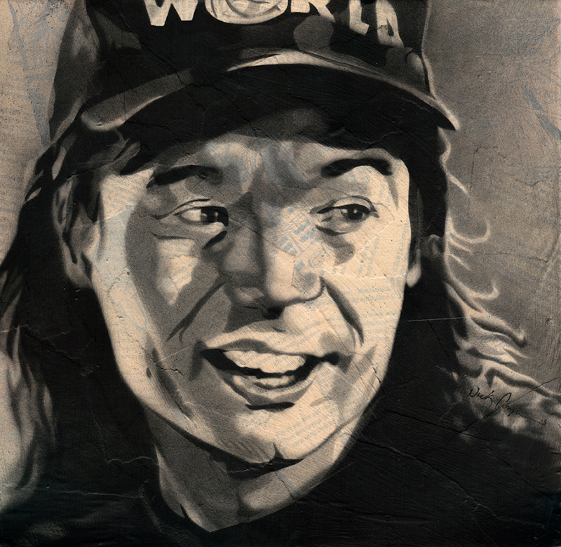 6-layer stencil, spray paint and collage on LP cover