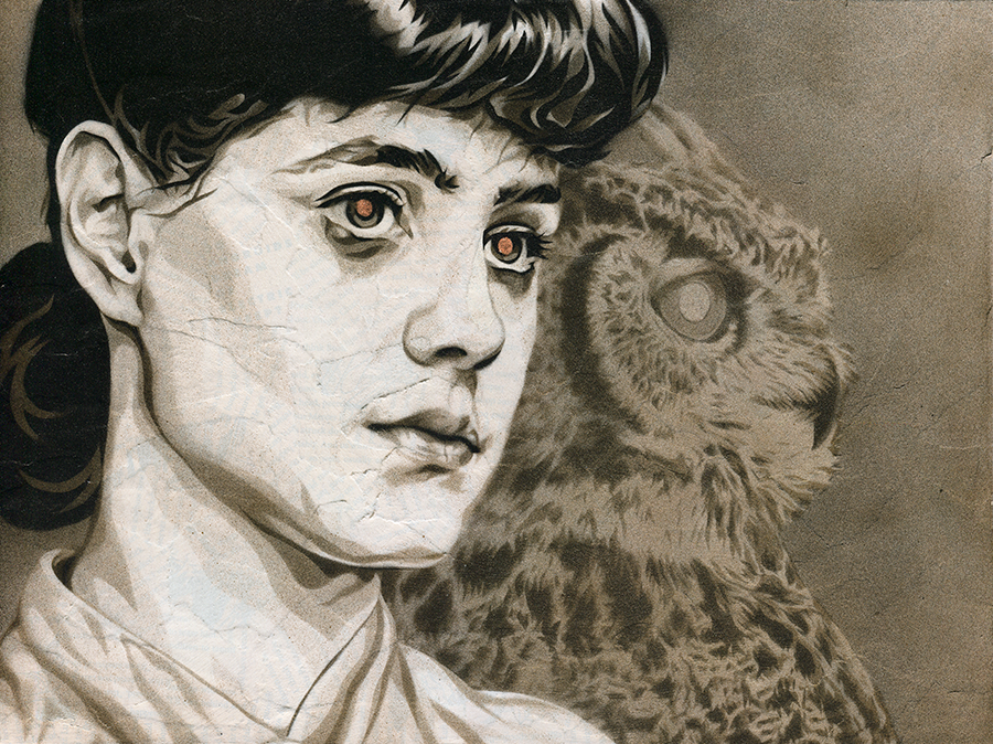 8-layer stencil, spray paint, copper leaf and collage on cradled panel
